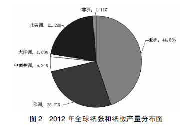 世界造紙行業(yè)從20 世紀(jì)80 年代初便開(kāi)始成功的轉(zhuǎn)向堿性或中性造紙工藝,這極大的提高了造紙對(duì)重鈣的需求,為重鈣產(chǎn)品提供了一個(gè)巨大的應(yīng)用市場(chǎng)。在造紙中添加碳酸鈣可使涂布均勻、亮度好、摩擦度低、結(jié)構(gòu)堅(jiān)實(shí)、易排濕以及易干燥等。2012 年全球紙張和紙板總量為3.998 億t,亞洲、北美洲和歐洲作為全球主要的紙張和紙板生產(chǎn)地,其產(chǎn)量占全球總量的90 %以上,其中亞洲占44.66%,如圖2 所示。